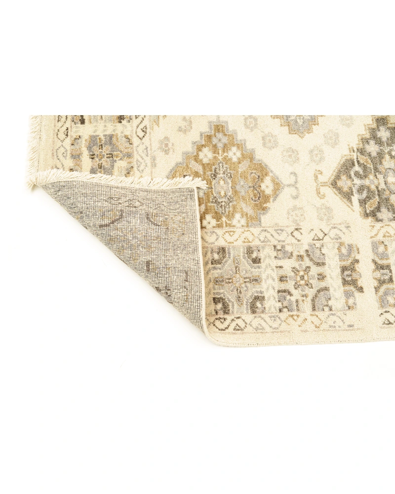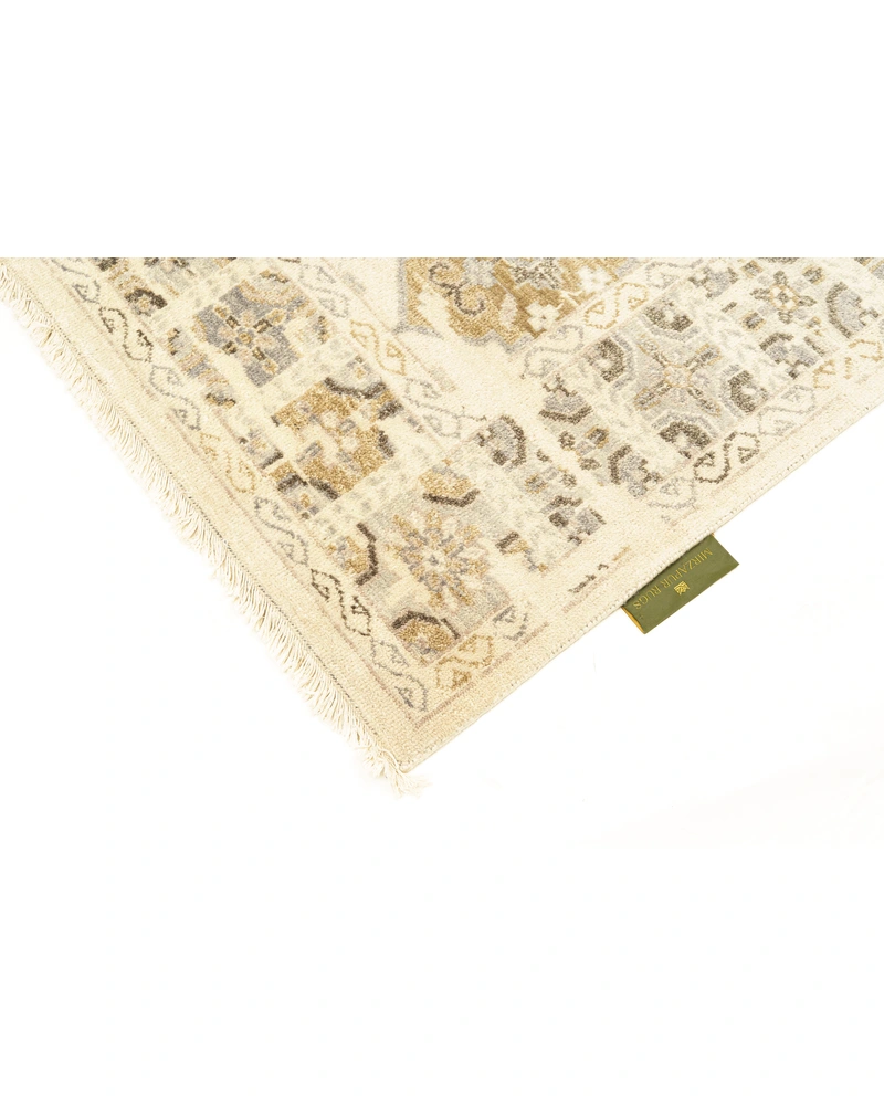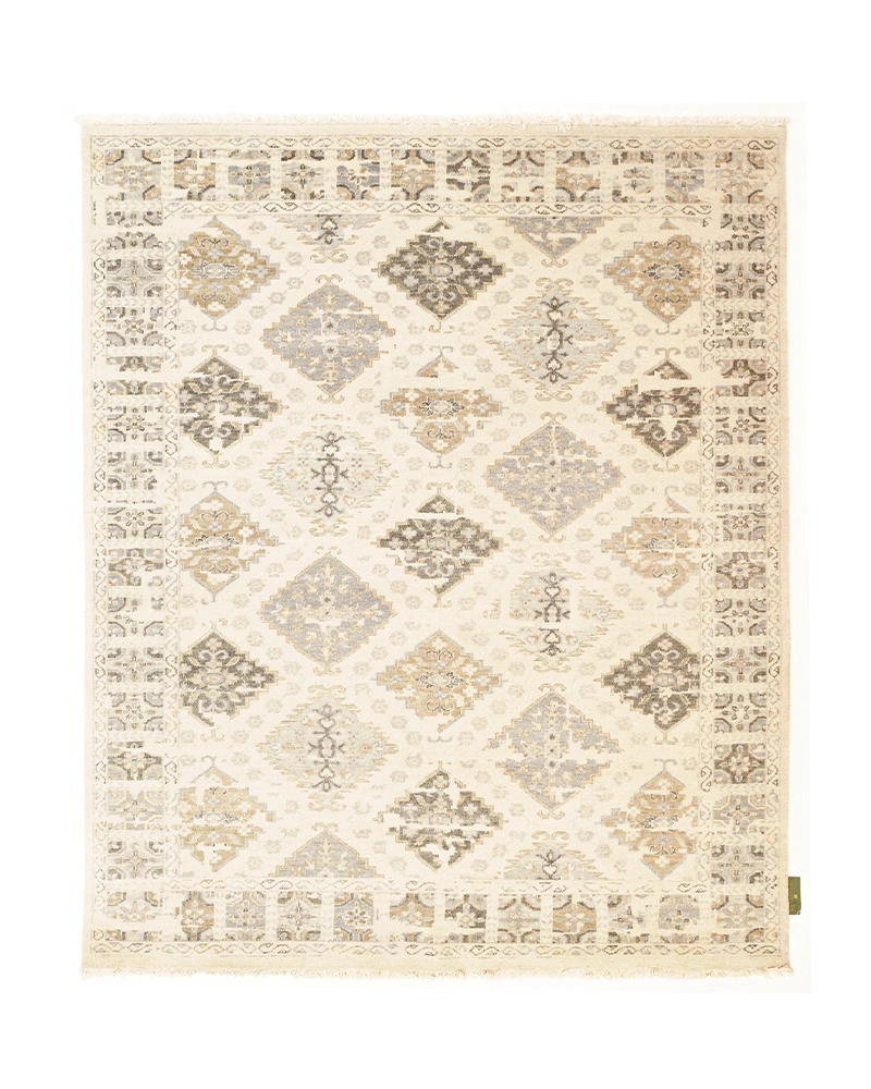 This premium handcrafted luxury rug celebrates timeless design, featuring intricate traditional diamond and medallion motifs. Set against a luminous ivory background, the pattern is rendered in a refined, neutral palette of warm gold and sophisticated grey, creating an opulent statement piece that adds historic elegance and texture to any modern space.